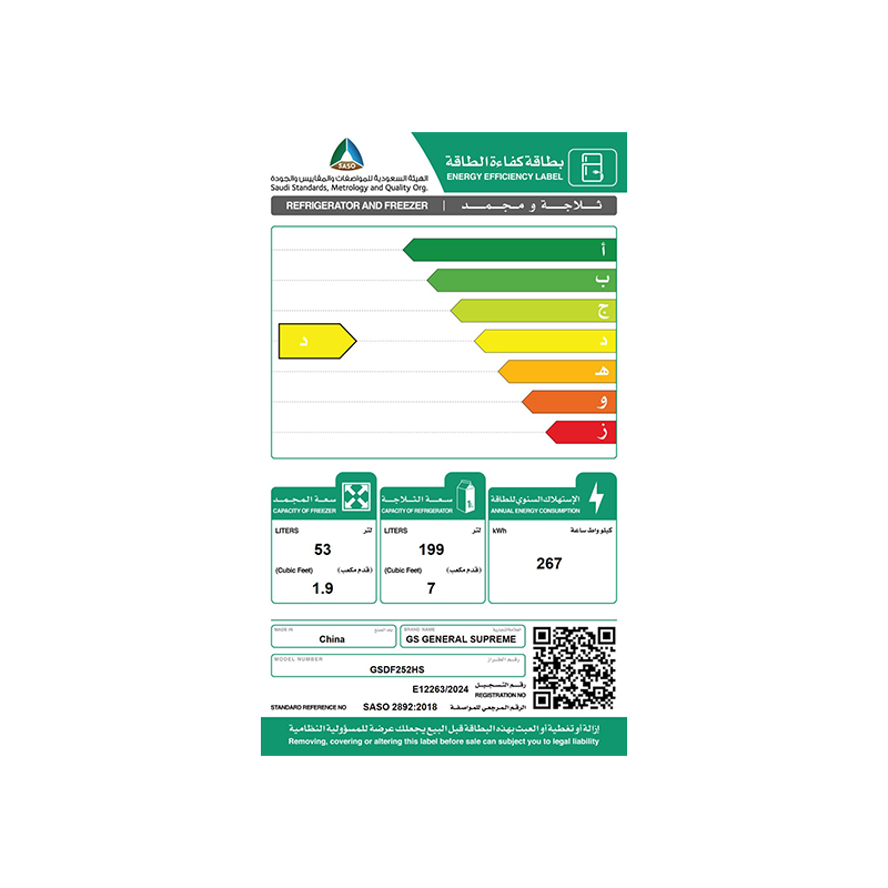 | السعة الكلية | 8.9 قدم / 252 لتر |